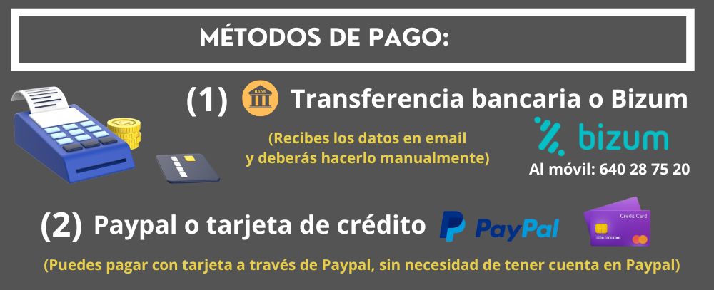 Si eliges Transferencia bancaria directa o Bizum, tendrás que realizar el Bizum o la transferencia bancaria manualmente, con los datos que te aparecerán en pantalla o en el email que recibirás después de realizar el pedido. El número de móvil es 640 28 75 20.
